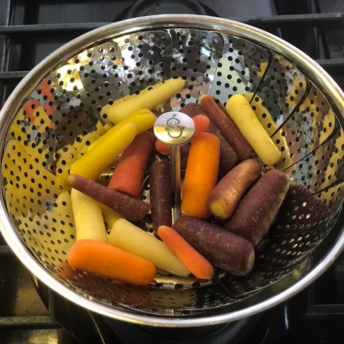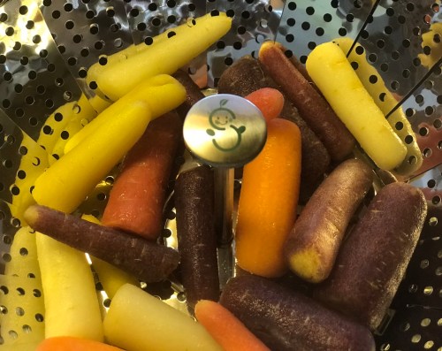 The Sage Spoonfuls Sage Baby Eco-Steamer has a super easy telescoping handle to fit inside a pot with the lid on; has 1.75 inch high legs to keep food above water and preserve nutrients; is made from eco-friendly, non-toxic stainless steel; plus is dishwasher safe. The cookbook gave recipe for steaming and great combinations for growing palettes. My earnest little is about 10 months and loves picking up soft chunks to self feed lately, so I chopped the carrots and apples instead of puréeing them.
